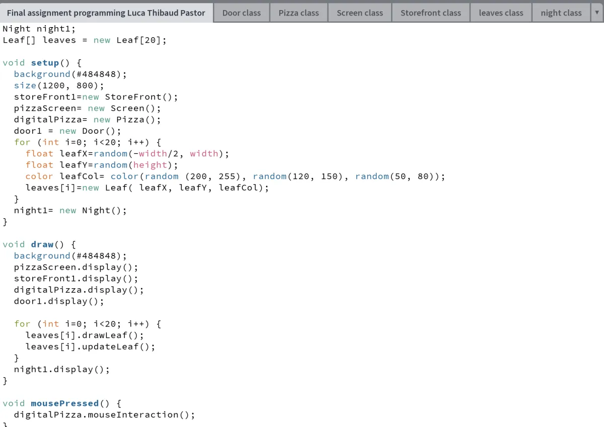A simulation game created entirely by code in processing, where players can design and customize their own pizzas, place and collect their orders, and manage the shop’s closing hours by temporarily disabling the interface for the night.